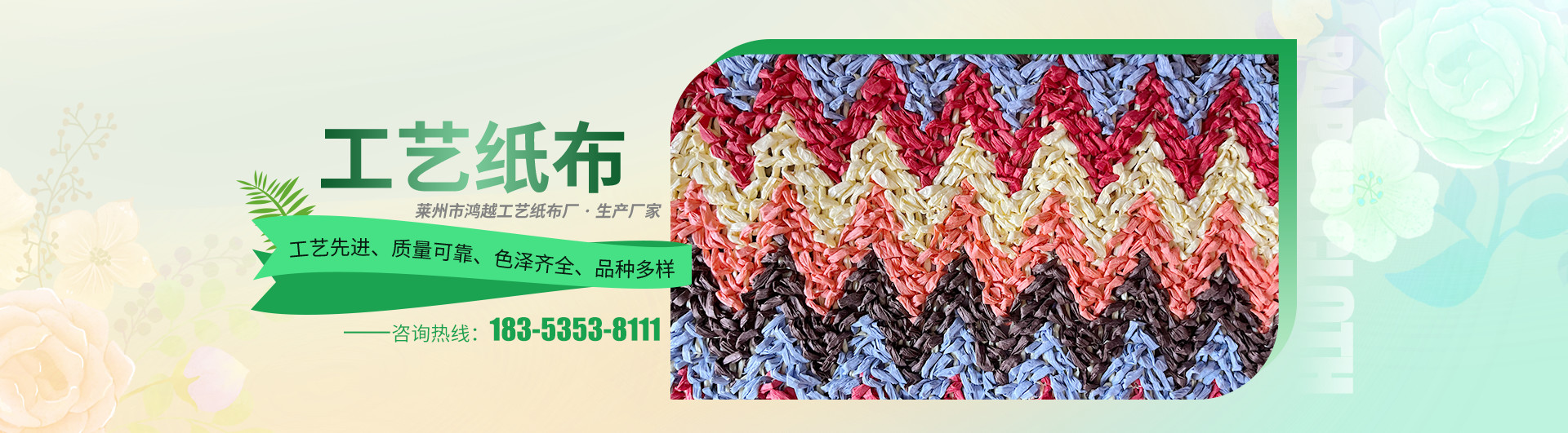 萊州市鴻越工藝紙布廠是專業生產工藝棉緯布、單絲紙布、雙絲紙布、拉拉草紙布、五分草紙布、其他特種工藝紙布的企業,技術力量雄厚,生 產能力強大,商業信譽保證,產品工藝先進、質量可靠、色澤齊全、品種多樣,并且具有強大的研發機構,保證及時、高質量地滿足客戶的意愿要求,此占“天時”之利。本廠地處青島、濰坊、煙臺···